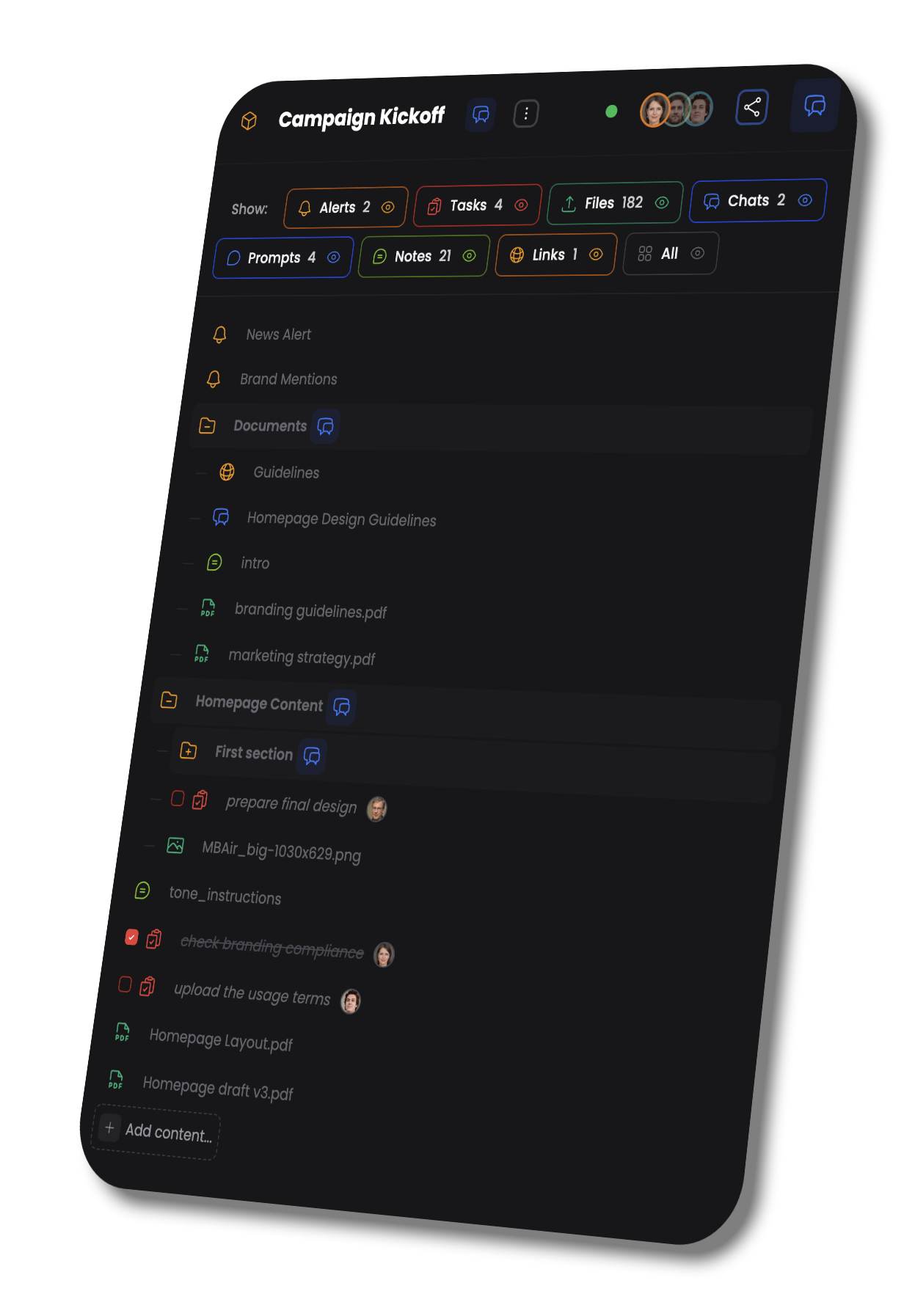 Generate drafts, rewrites, summaries, and variations—plus on-brand images—right inside the project. Review, refine, and ship faster.